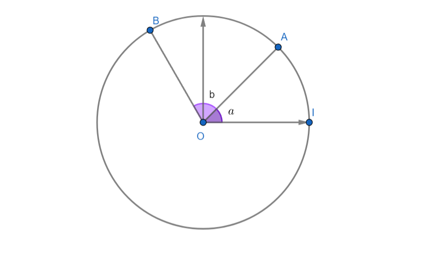 `(bar((vec(i), vec(OA)))) = a [2pi]` et `(bar((vec(i), vec(OB)))) = b[2pi]`